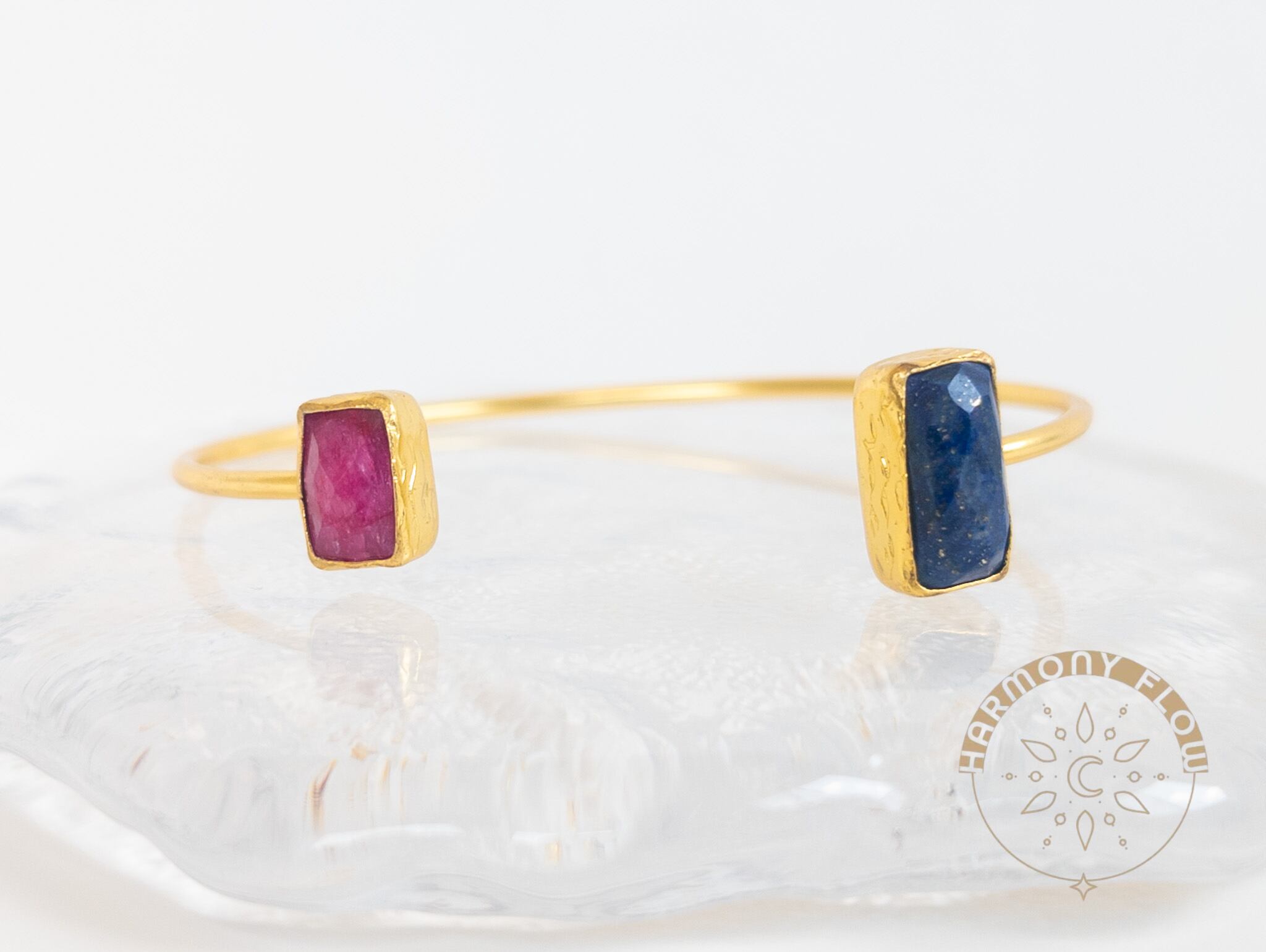 深いブルーのラピスラズリと鮮やかなルビーを組み合わせたバングル。