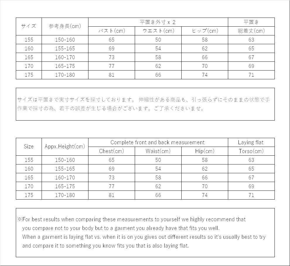 本製品のサイズ表は、商品を平置きの状態で仕上がり寸法を採寸した数値です。